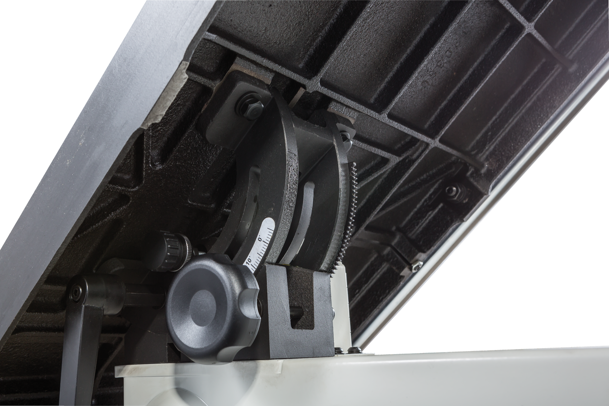 Jet JWBS-15 - ленточная пила нового поколения, предназначенная для профессионального использования. Ее основное преимущество, на фоне аналогов прошлых поколений, - увеличенная высота распиловки. Этот параметр очень важен для тех, кому нужен универсальный станок, способный взять на себя функции делительного. К подобным работам приспособлен и параллельный упор: направляющий профиль можно установить вертикально на боковую грань так, чтобы надежно фиксировать плоские заготовки при их роспуске на тонкие пластины. В целом конструкция бокового упора очень хорошо проработана и соответствует самым строгим требованиям: профиль жесткий и прочный, закреплен на массивном чугунном кронштейне, который перемещается по цилиндрической направляющей. Предусмотрена грубая (вручную) и точная (микрометрическим винтом) установка.