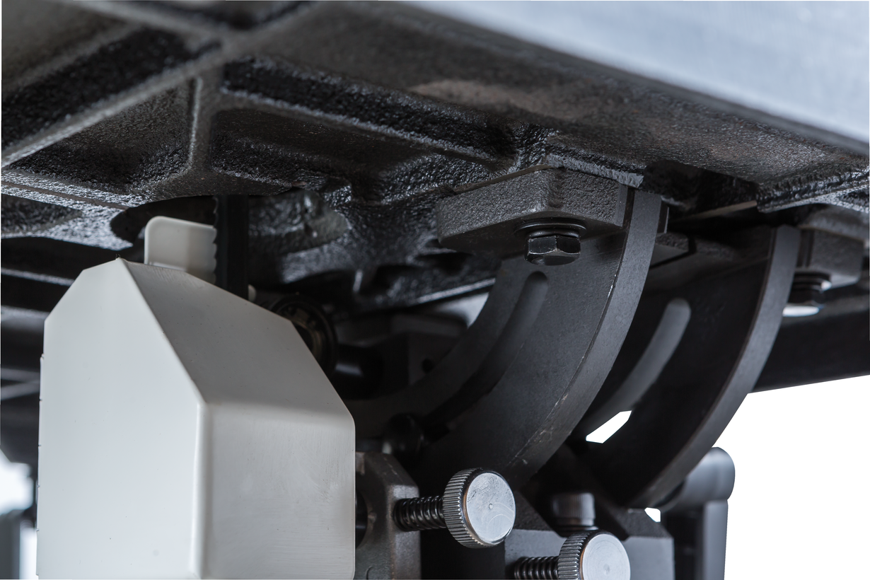 Рабочий стол чугунный, поворотные сегменты, на которые он опирается, из этого же материала. Наклон производится при помощи зубчатого механизма вращением рукоятки и возможен в обе стороны (на 5° в сторону станка и на 45° от него). Для наибольшей эффективности пылеудаления установлено два 100-миллиметровых патрубка: один под рабочей поверхностью, второй в нижней части корпуса.