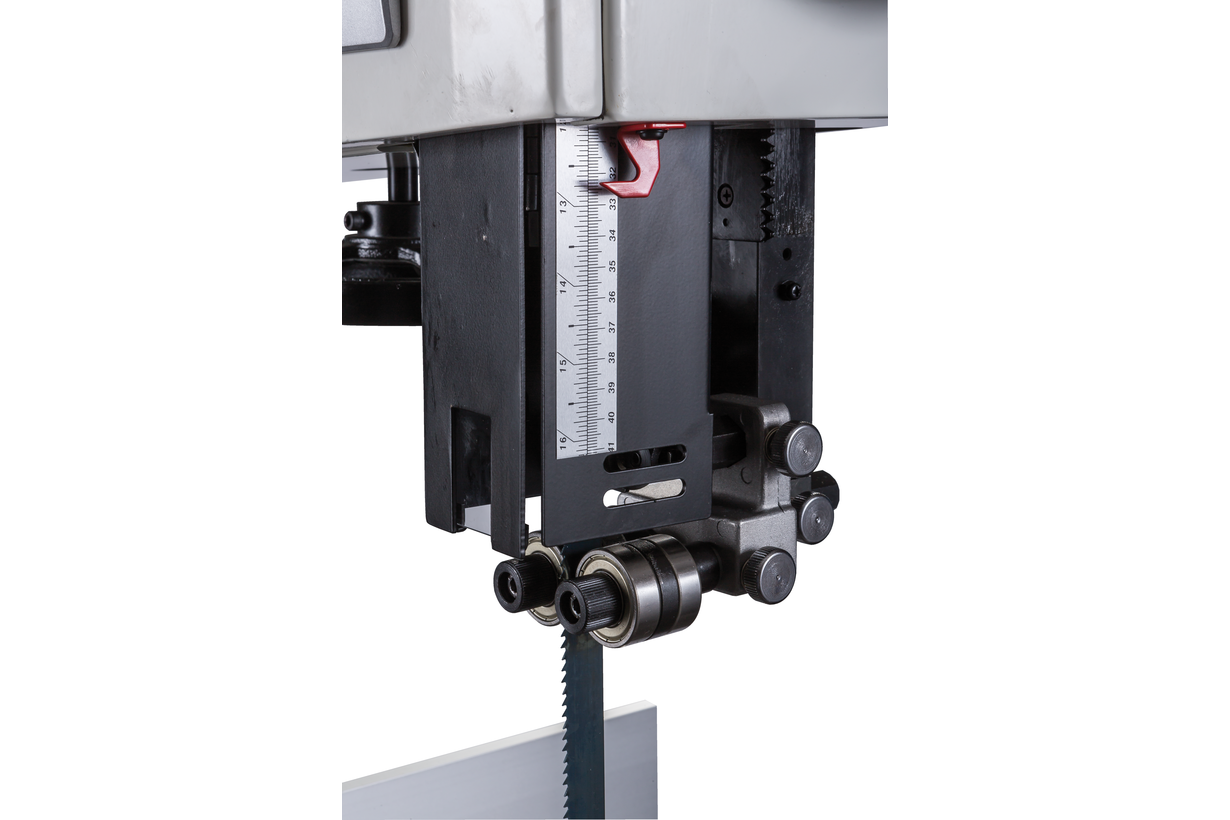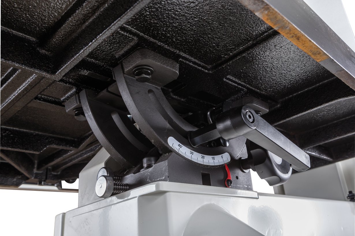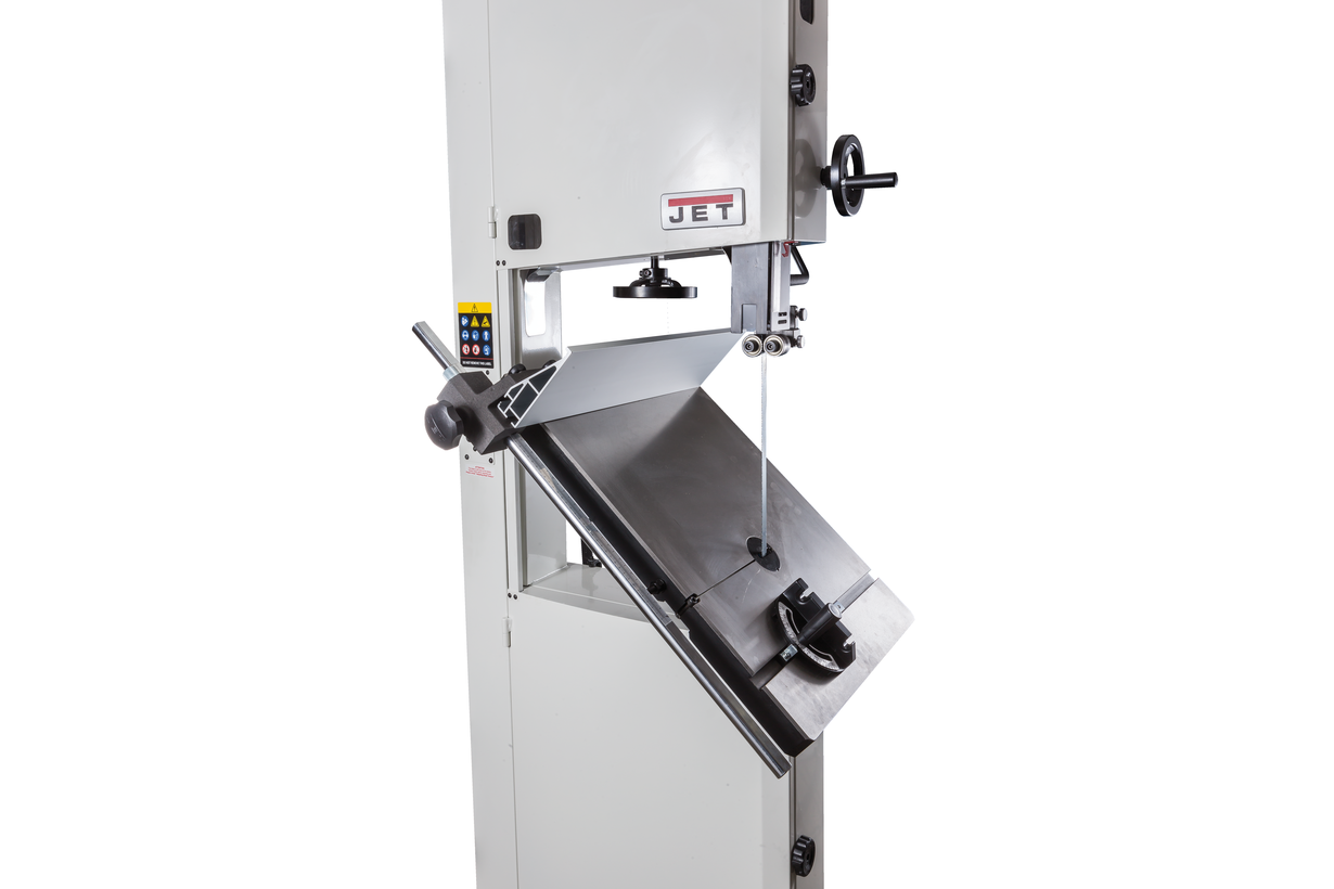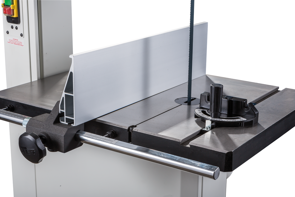 Jet JWBS-18 – новая ленточная пила для профессионального применения. Ее основное преимущество на фоне аналогов прошлых поколений – увеличенная высота распиловки. Этот параметр очень важен для тех, кому нужен универсальный станок, способный взять на себя функции делительного. К подобным работам приспособлен и параллельный упор: направляющий профиль можно установить вертикально на боковую грань так, чтобы надежно фиксировать плоские заготовки при их роспуске на тонкие пластины. В целом конструкция бокового упора очень хорошо проработана и соответствует самым строгим требованиям: профиль жесткий и прочный, закреплен на массивном чугунном кронштейне, который перемещается по цилиндрической направляющей. Предусмотрена грубая (вручную) и точная (микрометрическим винтом) установка.